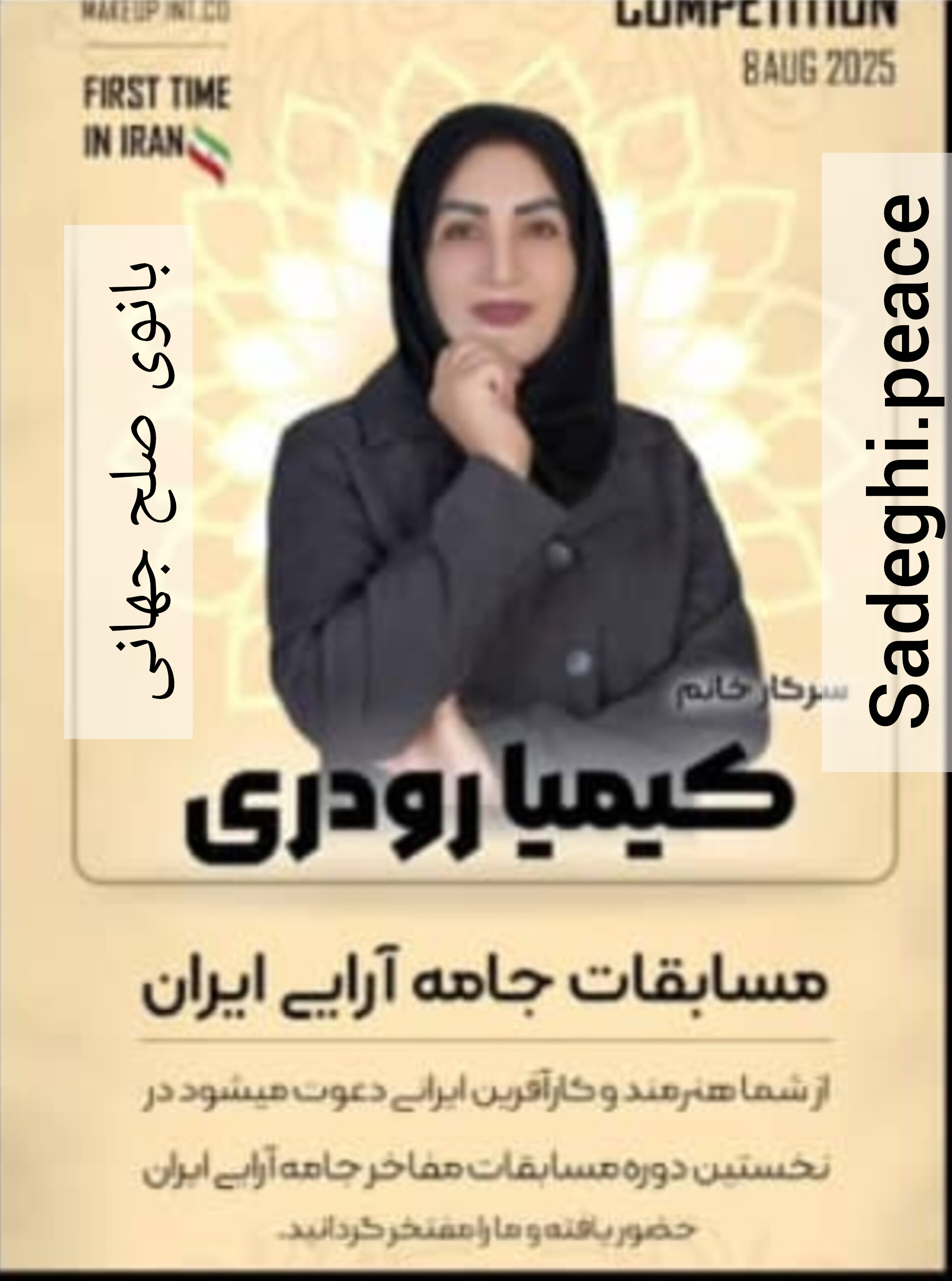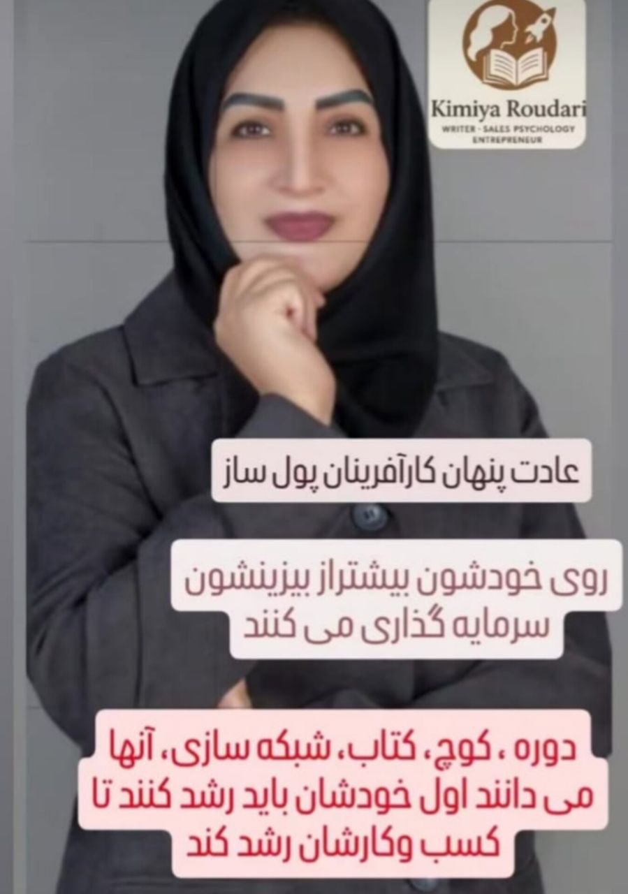 Kimiya Roodari, a child of Iran living in Kerman, is a human rights activist and a peace and friendship activist, She is an active member of the Hooshmand World Peace Foundation, She is an author, psychologist, and clothing designer. She has been recognized as a top entrepreneur for several years due to her success in economic activities combined with business psychology skills. Kimiya has written several books on sales psychology, financial intelligence, and money-making ideas. Her attention to mental and spiritual health has also led her to acquire skills in volleyball and shooting. Kimyia, a beautiful lady and social and cultural activist, has been a successful trainer with scientific and practical experience. Thirty years of practical and educational activity in the field of tailoring has made her designer with her own style. Kimiya's beauty of thinking and order in her social and personal life has also led her to obtain an international certificate in fashion and beauty..