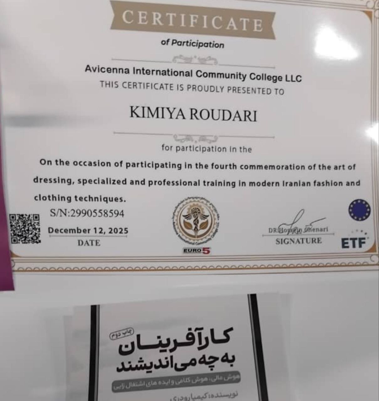زیبایی تفکر و نظم در زندگی اجتماعی و فردی کيميا موجب شد تا مدرک بینالمللی مد و زیبایی را نیز به دست اورد